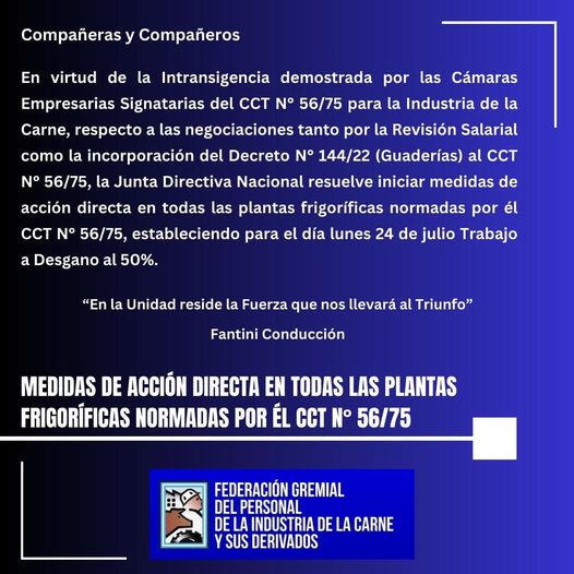 En virtud de la Intransigencia demostrada por las Camaras Empresarias Signatarias del CCT 56/75 para la Industria de la Carne, respecto a las negociaciones tanto por la Revisión Salarial como la Incorporación del Decreto 144/22 (Guaderias) al CCT 56/75, la Junta Directiva Nacional resuelve iniciar medidas de acción directa en todas las plantas frigoríficas normadas por él CCT 56/75, estableciendo para el día Lunes 24 de Julio Trabajo a Desgano al 50 %.
